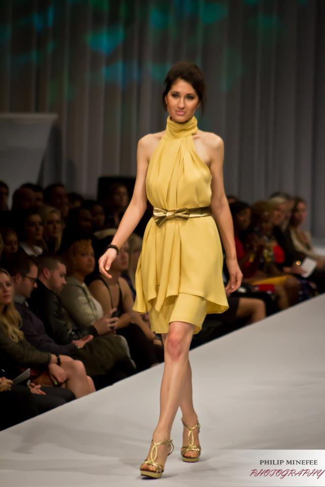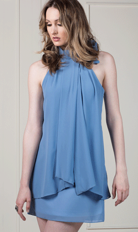 This romantic chiffon dress transitions easily from day to night and features a high neck with side tie-end closures and asymmetrical layers that flatter any body type.