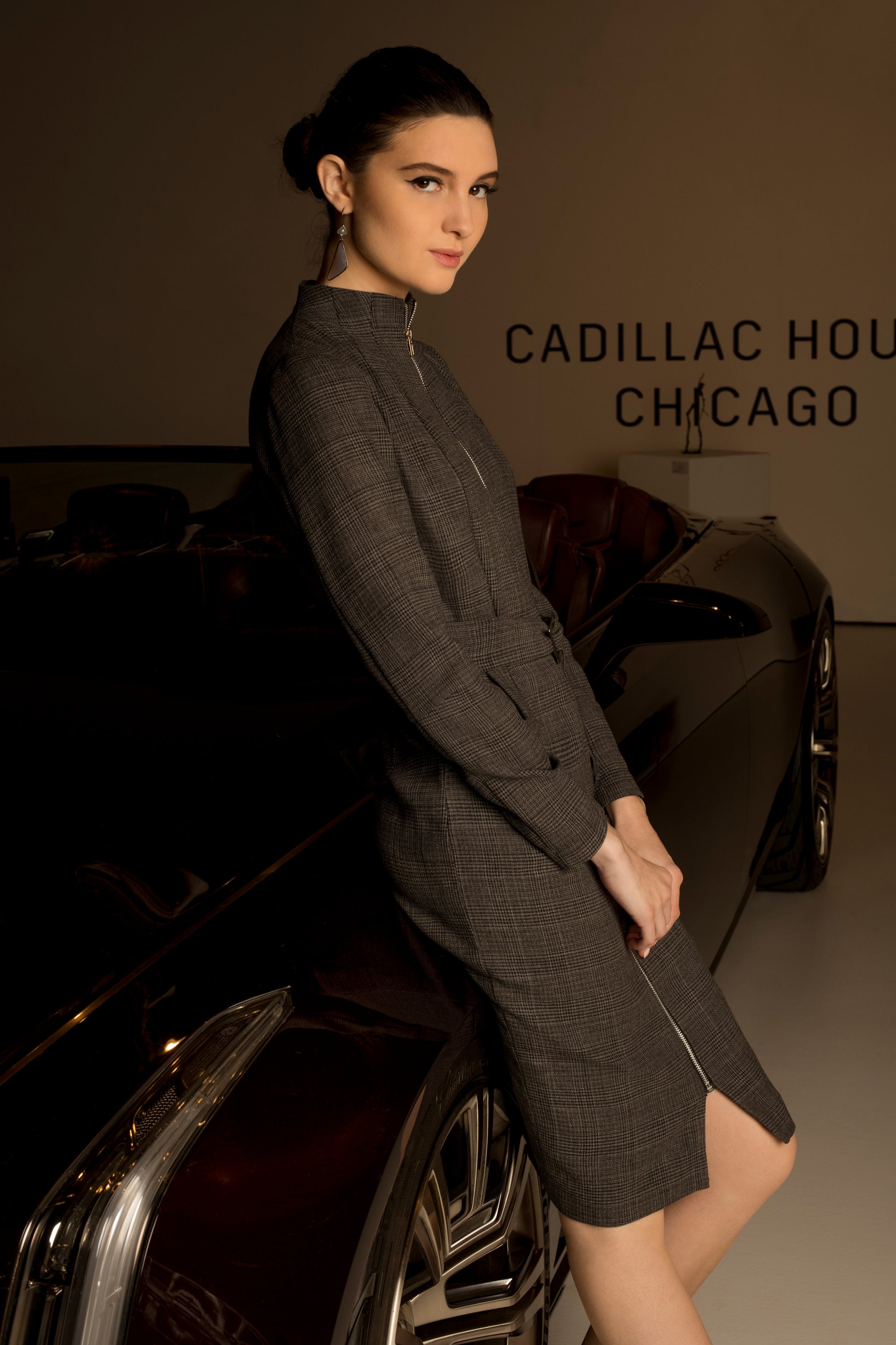 Grey - Zip Front Long Sleeve Fitted Dress